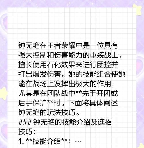 钟无艳作为王者荣耀中的一名战士英雄,以其出色的输出能力和坦度成为许多玩家的首选英雄。本文将为大家详细介绍如何针对不同情况合理选择钟无艳的出装,帮助玩家们更好地发挥他的实力。